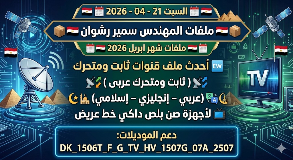<p dir="rtl"><strong>📅 السبــــت 21 – 04 – 2026 📅<br><br>🇪🇬📦🇪🇬 ملفات المهندس سمير رشوان 🇪🇬📦🇪🇬<br><br>🇪🇬🗓🇪🇬 ملفات شهر ابريل 2026 🇪🇬🗓🇪🇬<br><br>🆕 أحدث ملف قنوات ثابت ومتحرك</strong></p><p dir="rtl"><strong><br>( ثابت ومتحرك عربى )<br>(عربي – إنجليزي – إسلامي)<br>📺 لأجهزة صن بلص داكي خط عريض<br><br>DK_1506T_F_G_TV_HV_1507G_07A_2507</strong></p>
